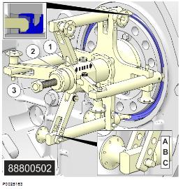 1 調(diào)整臂 88800501 安裝工具 并安裝工具。設(shè)定直徑:使用 A. Ø 151 前密封件 D13。1 前進(jìn):掛鉤松開(kāi)向后:掛鉤扣緊2 張緊螺母3 緩慢拉出密封件。安裝重要事項(xiàng)!密封環(huán)的金屬側(cè)必須向內(nèi)。
