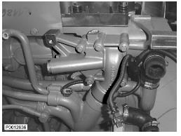 21 僅適用于 D13B-A/C/G/H/K/L,D13C2-A,D13C4-A(雙渦輪增壓器)安裝 Y 形管(1)并固定螺栓。不要完全緊固螺栓。用新密封墊圈安裝(2)撓性管。安裝夾子并緊固。注意 標(biāo)注夾子的位置。緊固 Y 形管螺栓。注意 特殊扭矩,請參見安裝須知。緊固所有隔熱罩螺栓。注意 不要忘記前部螺栓或墊片位于歧管下面的兩個(gè)螺栓。