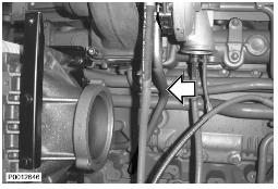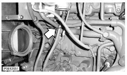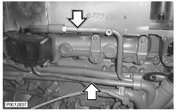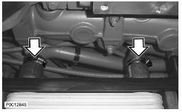 24 僅適用于 D13B-A/C/G/H/K/L,D13C2-A,D13C4-A(雙渦輪增壓器)緊固下部渦輪增壓器隔熱罩上的兩個(gè)螺栓(1)。將水軟管(2)夾緊至回油管上。