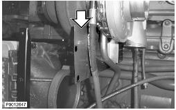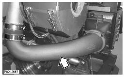 11 僅適用于 D13B-A/C/G/H/K/L,D13C2-A,D13C4-A(雙渦輪增壓器)向上提升增壓空氣冷卻器并將軟管滑到冷卻軟管上。使用所有螺栓固定增壓空氣冷卻器。