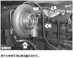 23 僅適用于 D13B-A/C/G/H/K/L,D13C2-A,D13C4-A(雙渦輪增壓器)檢查 Y 形管上的渦輪密封表面并安裝一個(gè)新襯墊。安裝后渦輪增壓器。注意 特殊扭矩,請參見安裝須知。將水軟管安裝到渦輪增壓器上。將回油管(1)連接到渦輪增壓器上。注意 在安裝在飛輪殼上的密封環(huán)上涂抹 VP 潤滑油(零件號 1698135-8)以方便油管安裝。將油管(2)連接到渦輪增壓器上并將其夾緊至吊耳上。