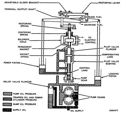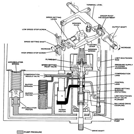 動(dòng)力活塞同傳動(dòng)器的終端(輸出)軸相連,發(fā)動(dòng)機(jī)的燃料架聯(lián)動(dòng)裝置也與終端軸相連。當(dāng)發(fā)動(dòng)機(jī)的負(fù)載發(fā)生改變時(shí),動(dòng)力活塞的運(yùn)動(dòng)會(huì)轉(zhuǎn)動(dòng)終端軸,聯(lián)動(dòng)裝置將使燃料架移動(dòng)到新的設(shè)定之上,從而與新負(fù)載條件下的發(fā)動(dòng)機(jī)速度保持一致。