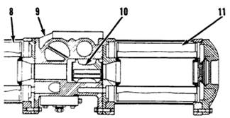 當(dāng)手柄(4)被拉到“輔運(yùn)轉(zhuǎn)”位置時(shí),潤(rùn)滑油會(huì)被輔助濾芯清理掉。過(guò)濾后的油會(huì)經(jīng)檢驗(yàn)閥(10)向右流并阻塞主倉(cāng)內(nèi)的油路。在這個(gè)位置,當(dāng)油壓消失后,主過(guò)濾管將被更換,主倉(cāng)會(huì)被抽空。