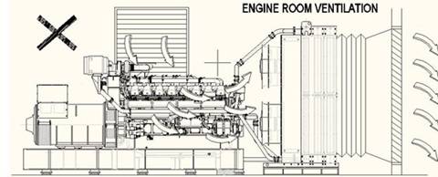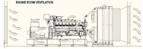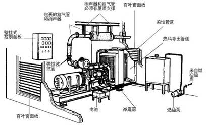 3. 典型的機房布置應(yīng)具有來自散熱器的熱風(fēng)用導(dǎo)風(fēng)管道排至機房外并且避免回流 排氣系統(tǒng)從屋頂進行支撐,安裝彈性波紋管來隔離引擎和排氣系統(tǒng)熱風(fēng)導(dǎo)出管道,燃油管路和電氣相對引擎和交流發(fā)電機的連接,留有一點的余量日用油箱通過機房外遠置安裝的油庫供應(yīng)在發(fā)動機沒有運行期間,啟動電池必須使用充電器充滿,該充電器可以集成在控制柜內(nèi)。