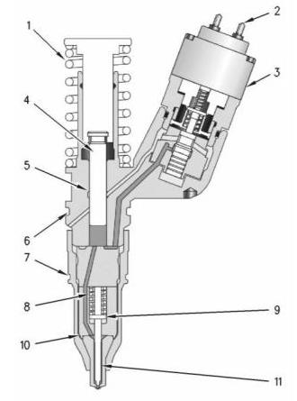 當(dāng)電子單體噴油器機構(gòu)將力傳遞到電子單體噴油器的頂部時,彈簧(1)被壓縮,柱塞(4)向下驅(qū)動。此操作通過電磁閥總成(3)中的閥將燃油置換到燃油箱的回油歧管中。當(dāng)柱塞向下移動時,缸筒(5)中的油道被柱塞的外徑封閉。閥體(10)內(nèi)和沿單向閥(11)至噴油器尖端的油道中已經(jīng)含有用于噴射的燃油。當(dāng)柱塞缸中的油道關(guān)閉后,噴油器隨時準(zhǔn)備噴射。噴射的開始依賴于電子控制模塊(ECM)中的軟件。