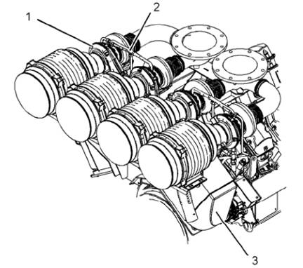 Perkins4016柴油發(fā)動機在發(fā)動機后端安裝了四個渦輪增壓器(1)。每個渦輪增壓囂的渦輪機側(cè)都連接至該渦輪增壓器的排氣歧管。每個渦輪增壓器的壓縮機側(cè)都通過管道與后冷器殼體相連。