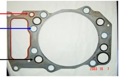 康明斯Cummins QSK23發(fā)動(dòng)機(jī)缸墊的通道針對(duì)內(nèi)部流動(dòng)的不同流體使用不同的密封材料。 紅色的密封機(jī)油通道, 黑色的密封冷卻液通道, 藍(lán)色的密封缸蓋螺栓周圍。