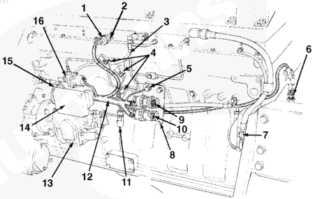 1油軌壓力傳感器,2燃油連接塊,3燃料切斷閥4發(fā)動機線束,5 C6 接頭,6 C5 接頭,7 OEM C5 和 C6 接頭支架,8發(fā)動機轉(zhuǎn)速傳感器,9系統(tǒng)接地接頭,10液壓機械式 STC 執(zhí)行器,11發(fā)動機側(cè)數(shù)據(jù)通信接頭,12保險絲 (5A),13 ECM,14燃油泵,15電子燃油控制閥。