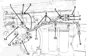 1燃料切斷閥,2燃油連接塊,3油軌壓力傳感器,4保險絲 (5A),5系統(tǒng)接地接頭,6 OEM C5 和 C6 接頭支架,7 C5 接頭,8 C6 接頭,9發(fā)動機轉(zhuǎn)速傳感器,10發(fā)動機側(cè)數(shù)據(jù)通信接頭,11發(fā)動機線束,12燃油泵,13 ECM,14電子燃油控制閥。
