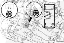 將萬用表的正極 (+) 表筆與起動馬達電磁閥的正極電纜端子相連接,將負極 (-) 表筆與底盤或發(fā)動機接地位置相連。