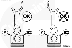 由于氣門套位于活塞頂部,QSK78 鍛造鑄鐵 (FCD) 活塞必須以特定的方向安裝?!癊X”標(biāo)記位于連桿柄的長(zhǎng)側(cè),而“V”標(biāo)記位于連桿柄的短側(cè)。