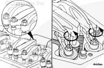 這種調(diào)節(jié)可從任一氣門設(shè)置標(biāo)記開始。在插圖中,假設(shè) 1R-6R 或 1R-8R 標(biāo)記已經(jīng)對(duì)準(zhǔn),且右排 1 號(hào)缸上的氣門已經(jīng)關(guān)閉,可以開始調(diào)整調(diào)節(jié)螺釘高度。