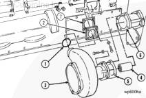 拆下將支架 (4) 固定到缸體上的兩個(gè)螺釘和重型墊圈 (6)。拆下將殼體 (2) 固定到水泵 (3) 上的四個(gè)螺釘。注意兩個(gè)墊圈 (5) 為重型墊圈。拆下支架。從泵上拉下殼體。拆下并廢棄 O 形圈 (1)。