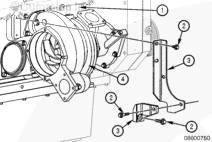 從康明斯發(fā)動(dòng)機(jī)缸體 (1) 和水泵支架 (3) 上拆下 2 個(gè)螺釘 (2)。從水泵 (4) 和水泵支架 (3) 上拆下 2 個(gè)螺釘 (2)。從水泵 (4) 和發(fā)動(dòng)機(jī)缸體 (1) 上拆下螺釘 (2) 和水泵支架 (3)。