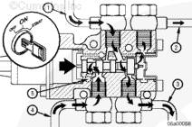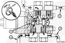 當(dāng)鑰匙開(kāi)關(guān)接通時(shí),Bosch® EHAB 裝置通電并且滑閥移動(dòng),使燃油從油箱流到燃油輸油泵或從濾清器流入噴油泵油道。自油箱流入的燃油,自噴油泵油道的燃油溢流,流至輸油泵的燃油,已過(guò)濾燃油流入,噴油泵進(jìn)口(已過(guò)濾燃油)