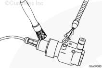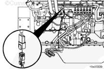 將車(chē)輛鑰匙開(kāi)關(guān)轉(zhuǎn)到斷開(kāi) (OFF) 位置。斷開(kāi) 9-針 Deutsch 噴油泵電氣接頭。不要斷開(kāi) 2-針 EHAB 裝置接頭
