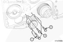 注: 檢查 O 形圈有無(wú)刻痕或切口,確保 O 形圈在凹槽中沒(méi)有扭曲。使用 Lubriplate™ 105 馬達(dá)組裝潤(rùn)滑脂或等同物潤(rùn)滑 O 形圈和機(jī)油泵凹槽。將一個(gè) O 形圈安裝到機(jī)油泵的凹槽中。潤(rùn)滑脂將使 O 形圈固定在凹槽中。將機(jī)油泵安裝到缸體上。將一個(gè)長(zhǎng)螺栓 (1) 和兩個(gè)短螺栓(2、3)安裝到機(jī)油泵中。擰緊所有螺栓。