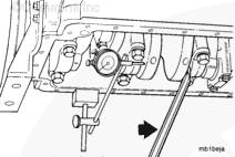 使用千分表測量曲軸軸向間隙。使用撬棍將曲軸向端部移動。將千分表歸零。使用撬棍將曲軸向相反方向移動。使用千分表測量曲軸軸向間隙。