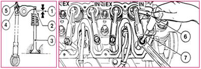 調(diào)整氣門間隙之前,停機(jī)30分鐘,油溫要低于80℃。用塞尺6檢查2、3之間的間隙1,塞尺塞入后要有輕度 磨擦,正確的氣門間隙;進(jìn)氣門:0.3mm,排氣門:0.5mm,(每次更換氣缸墊后,氣門間隙增加0.1mm,運(yùn)轉(zhuǎn) 50-150小時后重新調(diào)整)。按如下步驟調(diào)整氣門間隙: -松開鎖母4。用改錐7擰螺栓5,上緊鎖母4,得到正確的氣門間隙。 檢查、調(diào)查其他各缸的氣門間隙。裝好氣門室蓋(如需要,更換墊圈)。