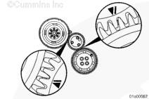 安裝康明斯ISX15 CM2250發(fā)動(dòng)機(jī)止推軸承、軸和燃油泵惰輪。安裝軸時(shí),必須使對(duì)齊標(biāo)記 (1)(壓印在齒輪座圈上)朝向下剪式惰輪中間。