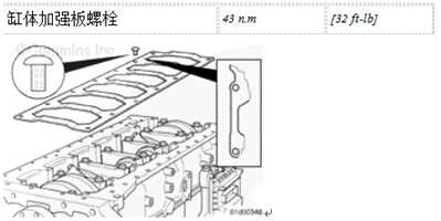 注: 對(duì)于有些油底殼/吸油管的配置,其中有一個(gè)缸體加強(qiáng)板的安裝螺栓與其余螺栓不同。這個(gè)有低螺栓頭的的螺栓應(yīng)安裝在與吸油管安裝位置相鄰的開(kāi)口處。有些應(yīng)用中使用低螺栓頭的螺栓可確保吸油管和缸體加強(qiáng)板安裝螺栓之間有足夠的間隙。