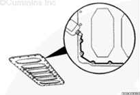 注: 安裝三個(gè)導(dǎo)向銷(xiāo)(零件號(hào) 3164977)以改進(jìn)油底殼密封部件與缸體之間的對(duì)準(zhǔn)情況。