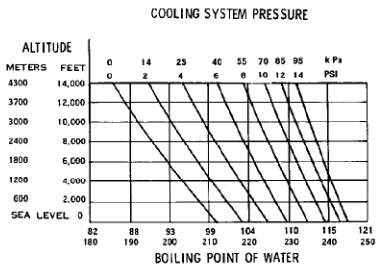 沸點受三種因素影響:壓力,海拔和冷卻液中的乙二醇濃度。液體沸點隨著壓力增加而增加。液體沸點隨著海拔高度增加而降低。圖39顯示壓力和海拔對水的沸點的影響。