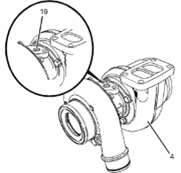 12.從進(jìn)油口(19)處拆下螺塞。請參閱插圖54。用清潔的發(fā)動機機油通過進(jìn)油口潤滑Perkins1106A/C發(fā)動機渦輪增壓器軸承。將壓縮機葉輪轉(zhuǎn)動幾次以便潤滑軸承。