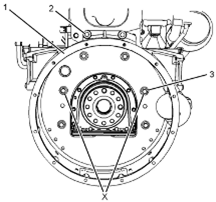 Perkins1106A/C發(fā)動機機殼體-拆卸和安裝 (標(biāo)準(zhǔn)Perkins1106A/C發(fā)動機機殼體) 拆卸步驟 開始: a.拆下飛輪。有關(guān)正確的步驟,請參閱《Perkins1106A/C發(fā)動機拆解和組裝》,“飛輪-拆卸”。 注意:保持所有零件清潔無雜質(zhì)。雜質(zhì)會造成快速磨損和縮短部件壽命。 1將螺栓(3)從Perkins1106A/C發(fā)動機飛輪Perkins1106A/C發(fā)動機機殼體(1)的位置(X)上拆下。 2將工具(A)安裝在Perkins1106A/C發(fā)動機飛輪Perkins1106A/C發(fā)動機機殼體(1)上的位置(X)。 3將適當(dāng)?shù)钠鸬踉O(shè)備安裝到Perkins1106A/C發(fā)動機飛輪Perkins1106A/C發(fā)動機機殼體上來支撐住Perkins1106A/C發(fā)動機飛輪Perkins1106A/C發(fā)動機機殼體。Perkins1106A/C發(fā)動機飛輪Perkins1106A/C發(fā)動機機殼體的重量約為40kg(88lb)。 4將螺栓(2)和其余螺栓(3)從Perkins1106A/C發(fā)動機飛輪Perkins1106A/C發(fā)動機機殼體(1)上拆下。 5使用適當(dāng)?shù)钠鸬踉O(shè)備,將Perkins1106A/C發(fā)動機飛輪Perkins1106A/C發(fā)動機機殼體(1)從Perkins1106A/C發(fā)動機缸體上卸下。 6.拆下防塵密封件(5)。 7.如有必要,將定位銷(4)從Perkins1106A/C發(fā)動機缸體上卸下。 安裝程序(標(biāo)準(zhǔn)Perkins1106A/C發(fā)動機機殼體) 注意:保持所有零件清潔無雜質(zhì)。雜質(zhì)會造成快速磨損和縮短部件壽命。 1.確保Perkins1106A/C發(fā)動機飛輪Perkins1106A/C發(fā)動機機殼體清潔且無損壞。如有必要,更換Perkins1106A/C發(fā)動機飛輪Perkins1106A/C發(fā)動機機殼體。 2檢查Perkins1106A/C發(fā)動機曲軸后油封(6)有無泄漏。如果觀察到漏油,更換Perkins1106A/C發(fā)動機曲軸后油封。有關(guān)正確的步驟,請參閱《Perkins1106A/C發(fā)動機拆解和組裝》,“Perkins1106A/C發(fā)動機曲軸后油封-拆卸”和《Perkins1106A/C發(fā)動機拆解和組裝》,“Perkins1106A/C發(fā)動機曲軸后油封-安裝”。 3清潔Perkins1106A/C發(fā)動機缸體后表面。如有必要,將定位銷(4)安裝到Perkins1106A/C發(fā)動機缸體上。 4將工具(A)安裝到Perkins1106A/C發(fā)動機缸體上。 5安裝防塵密封件(5)。 6將適當(dāng)?shù)钠鸬踉O(shè)備安裝到Perkins1106A/C發(fā)動機飛輪Perkins1106A/C發(fā)動機機殼體上。Perkins1106A/C發(fā)動機飛輪Perkins1106A/C發(fā)動機機殼體的重量約為40kg(88lb)。 7使用起吊設(shè)備對準(zhǔn)Perkins1106A/C發(fā)動機飛輪Perkins1106A/C發(fā)動機機殼體(1)與工具(A)。將Perkins1106A/C發(fā)動機飛輪Perkins1106A/C發(fā)動機機殼體安裝到Perkins1106A/C發(fā)動機缸體上。 8安裝螺栓(2)和螺栓(3)。 9拆下工具(A)。安裝其余的螺栓(3)。 10.當(dāng)安裝了8.8級別的螺栓時,按照步驟10.a至步驟10.b。 a.擰緊螺栓(3)至扭矩為63N·m(46lbft)。 b.擰緊螺栓(2)至扭矩為78N·m(58lbft)。 11.當(dāng)安裝了10.9級別的螺栓時,按照步驟11.a至步驟11.b。 a.擰緊螺栓(3)至扭矩為115N·m(85lbft)。 b.擰緊螺栓(2)至扭矩為190N·m(140lbft)。 12.檢查Perkins1106A/C發(fā)動機飛輪Perkins1106A/C發(fā)動機機殼體(1)和Perkins1106A/C發(fā)動機曲軸的對準(zhǔn)。有關(guān)更多信息,請參閱《系統(tǒng)操作、測試和調(diào)整》,“Perkins1106A/C發(fā)動機飛輪Perkins1106A/C發(fā)動機機殼體-檢查”。 結(jié)束: a.安裝飛輪。有關(guān)正確的步驟,請參閱《Perkins1106A/C發(fā)動機拆解和組裝》,“飛輪-安裝”。