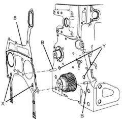 注:確保密封墊上的兩個(gè)圓形凸舌(X)與Perkins1106A/C發(fā)動(dòng)機(jī)缸體上的兩個(gè)孔(Y)接合。