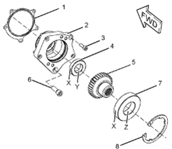 d.在軸承(7)和(4)的外表面(X)處涂敷一薄層連續(xù)的工具(B)。將Perkins1106A/C發(fā)動(dòng)機(jī)附件驅(qū)動(dòng)器Perkins1106A/C發(fā)動(dòng)機(jī)機(jī)殼體(2)放置在適當(dāng)?shù)闹Ъ苌?。將齒輪組件按入Perkins1106A/C發(fā)動(dòng)機(jī)附件驅(qū)動(dòng)器Perkins1106A/C發(fā)動(dòng)機(jī)機(jī)殼體中。確保軸承(4)抵到Perkins1106A/C發(fā)動(dòng)機(jī)附件驅(qū)動(dòng)器Perkins1106A/C發(fā)動(dòng)機(jī)機(jī)殼體(2)中的凹槽前表面上。清除過多的固定膠。