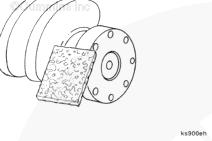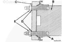 將安裝工具 (C) 的擴(kuò)孔端置于雙頭螺釘上,并且與承磨襯套對(duì)準(zhǔn),與曲軸端垂直。將墊圈(D)和螺母(E)安裝到螺紋雙頭螺釘上。